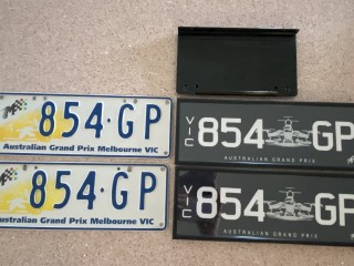 Time to sell my Grand Prix plates.I have owned this combo since new approx 23yrs. This special order plate of apparently only 1000 combos are no longer available. The special release of standard size black plates were only on my collector car for approx 2000klms and are therefore in excellent condition, my vehicle is now sold. These plates are being sold in the special edition black metal frame with its black metal mounting brackets that were supplied.I can also include the original coloured GP plates.